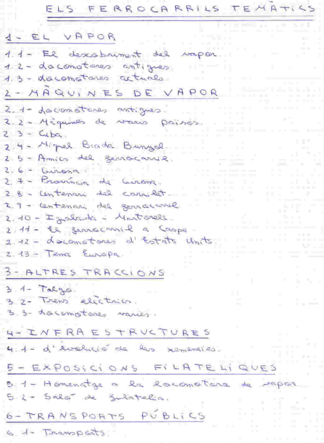 2.1.- Locomotores antigues; 2.2.- Màquines de varis països; 2.3.- Cuba; 2.4.- Miquel Biada i Bunyol; 2.5.- Amics del ferrocarril; 2.6.- Girona; 2.7.- Província de Girona; 2.8.- Centenari del carrilet; 2.9.- Centenari del ferrocarril; 2.10.- Igualada-Martorell; 2.11.- El ferrocarril a Caspe; 2.12.- Locomotores d'Estats Units; 2.13.- Tema Europa.