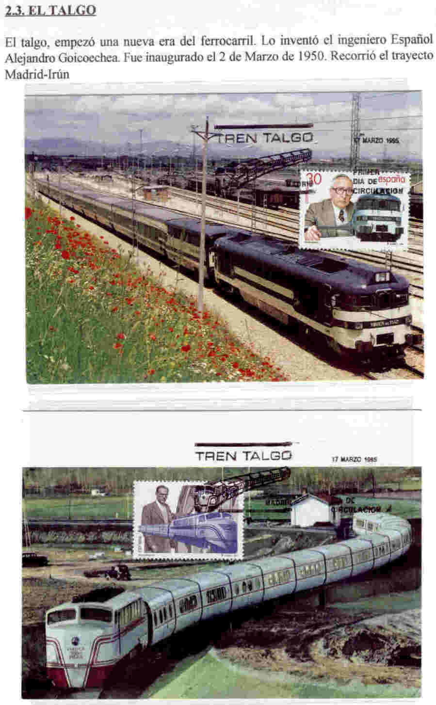 El talgo, empezó una nueva era del ferrocarril. Lo intentó el ingeniero Español Alejandro Goicoechea. Fue inaugurado el 2 de Marzo de 1950. Recorrió el trayecto Madrid-Irún.
