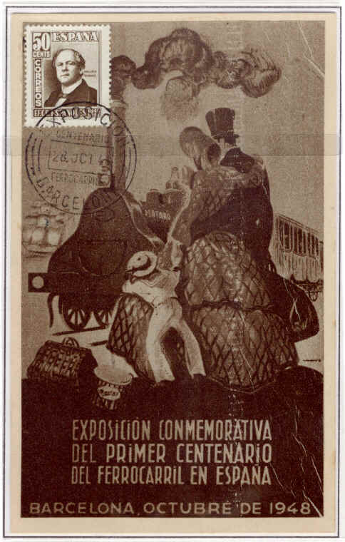 Exposició filatèlica del centenari del primer ferrocarril de la Península Ibèrica. El matasegells s'utilitzà del 24 d'octubre al 12 de desembre de 1948 al igual que la durada de l'exposició. La data exacta del centenari era la del 28 d'octubre (la que hi ha a la targeta). Pel que fa al segell, Correus va fer un error històric en fer un segell del Marquès de Salamanca, ja que era el pioner en el ferrocarril de Madrid a Aranjuez inaugurat al 1851. En aquest cas, el segell hauria d'haver estat d'en Miquel Biada i Bunyol que ideà la línia de Barcelona a Mataró.