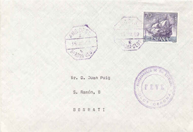 Ambulant descendent de Girona a Olot de l'últim dia de circulació. Tenia 2 treballadors i existeix en dues tintes: lila (la del sobre) i negre. També hi podem apreciar una marca de la FEVE (Ferrocarrils de Via Estreta) d'Olot-Girona, que actualment només té la línia que travessa les serralades cantàbriques.