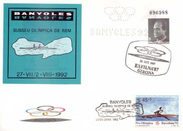 Enter postal de l'Exfilna'87 (Girona) matasegellat amb un matasegells de la candidatura de Banyoles'92 als Jocs Olímpics de Barcelona (utilitzat durant l'Exfilna'87), amb un altre de Banyoles com a subseu olímpica de rem (utilitzat al 1992) i una perforació en la que hi podem distinguir les 5 anelles olímpiques i la inscripció "Banyoles 92".